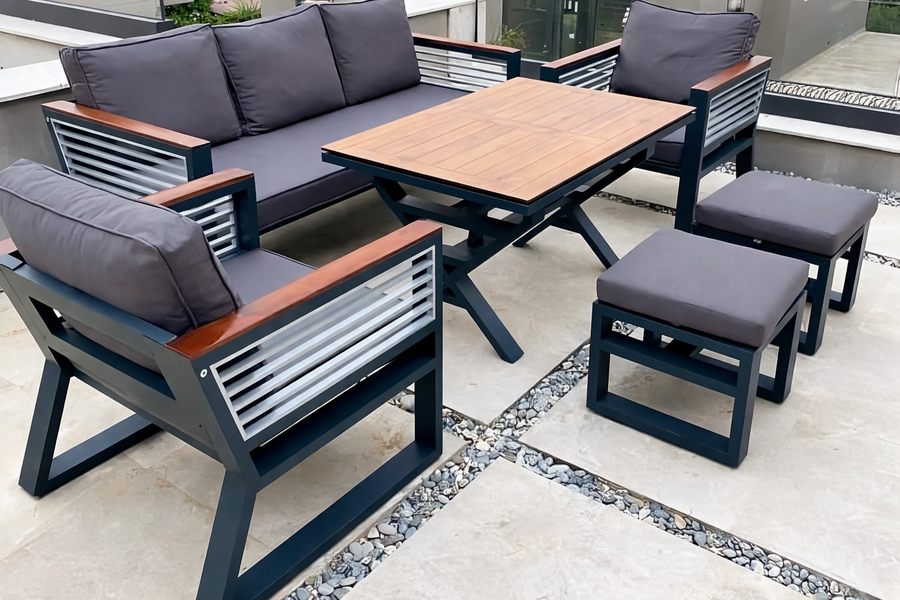 حوّل مساحتك الخارجية إلى واحة من الراحة والفخامة مع طقم الجلسات الخارجية الفاخر المصمم بعناية ليجمع بين الأناقة العصرية والمتانة العالية. يتميز الطقم بتصميم أنيق يناسب الحدائق، التراسات، البلكونات الواسعة، والأسطح، ليمنحك تجربة جلوس مريحة ومظهر راقٍ يدوم طويلاً.