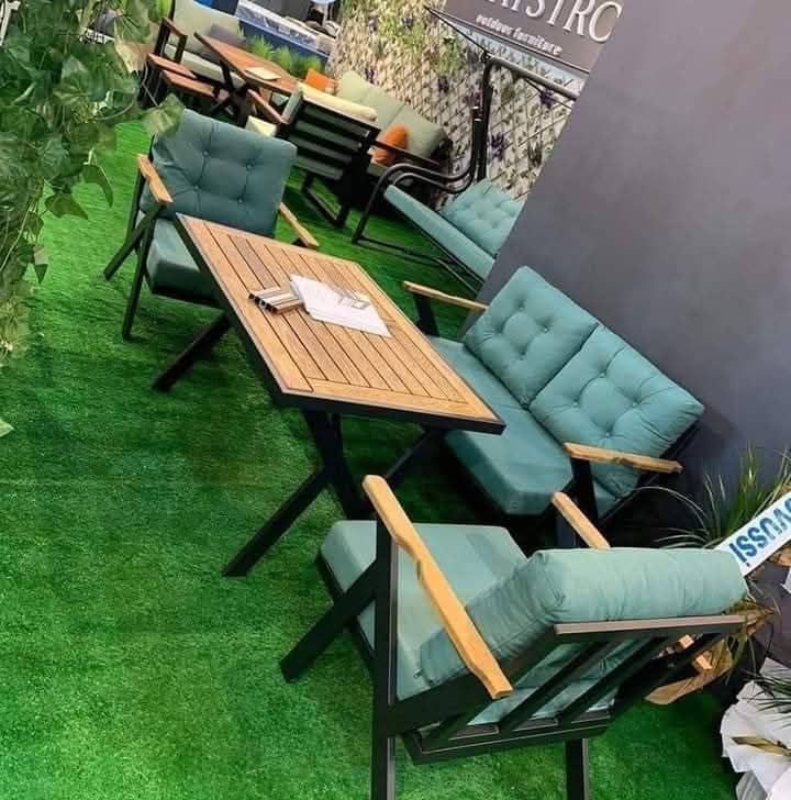 طقم جلسات خارجية فاخر بتصميم عصري يجمع بين الحديد المتين والخشب الطبيعي، مريح وأنيق ومثالي للحدائق، التراسات، والأسطح الخارجية.
