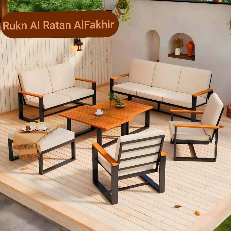 طقم جلسات خارجية فاخر بتصميم عصري يجمع بين الحديد المتين والخشب الطبيعي، مريح وأنيق ومثالي للحدائق، التراسات، والأسطح الخارجية.